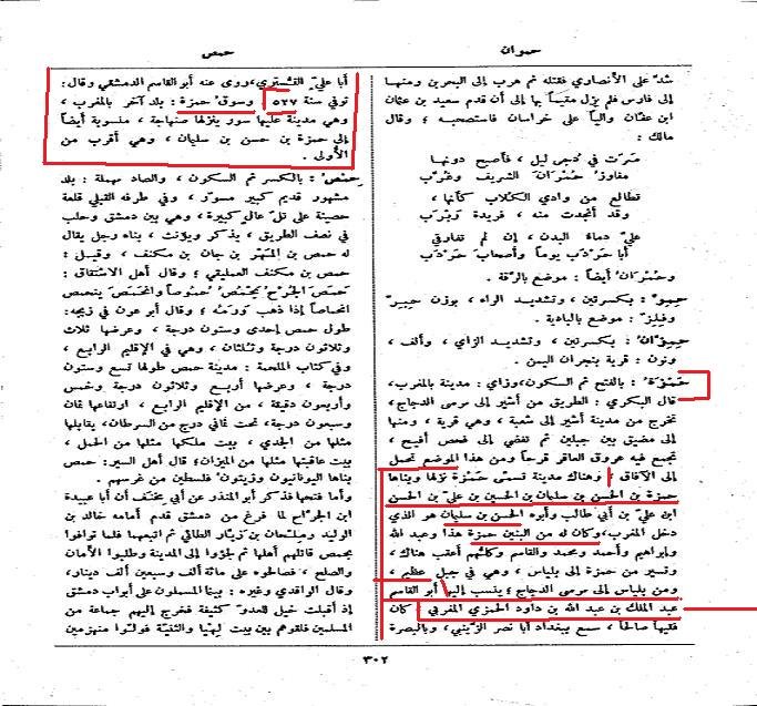 أبو القاسم عبد الملك بن عبد الله بن داود الحمزى حدث بسنن ابى داود السجستاني عن ابى على على بن احمد التسترى، وحدث عن ابى نصر محمد بن محمد الزينبي حدث عنه أبو القاسم ابن عساكر الحافط وأبو سعد عبد الكريم بن محمد السمعاني وقال [ هذه النسبة إلى حمزة وقيل هي ] حمزى، مدينة بالمغرب، وفى هذا القول عندي نظر وقد سألت عن هذا الموضع جماعة من المغرب فلم يعرفوه (قال المعلمى: في معجم البلدان اثباتها وأنها حمزة باسم بانيها، وإثبات بلد آخر بالمغرب يقال له سوق حمزة).
