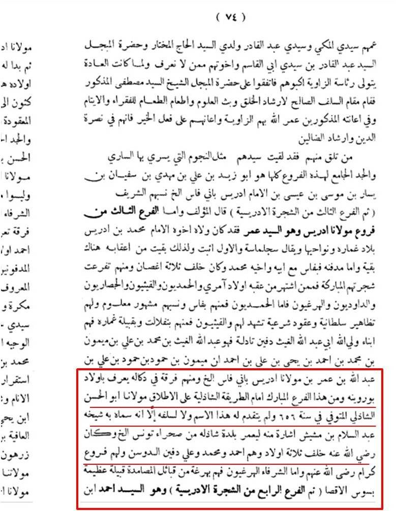وفي كتاب سلسلة الأصول في شجرة أبناء الرسول لسيدي أبي حشلاف ورد أيضا النسب الإدريسي للإمام الشاذلي رضي الله عنه صفحة 74 :