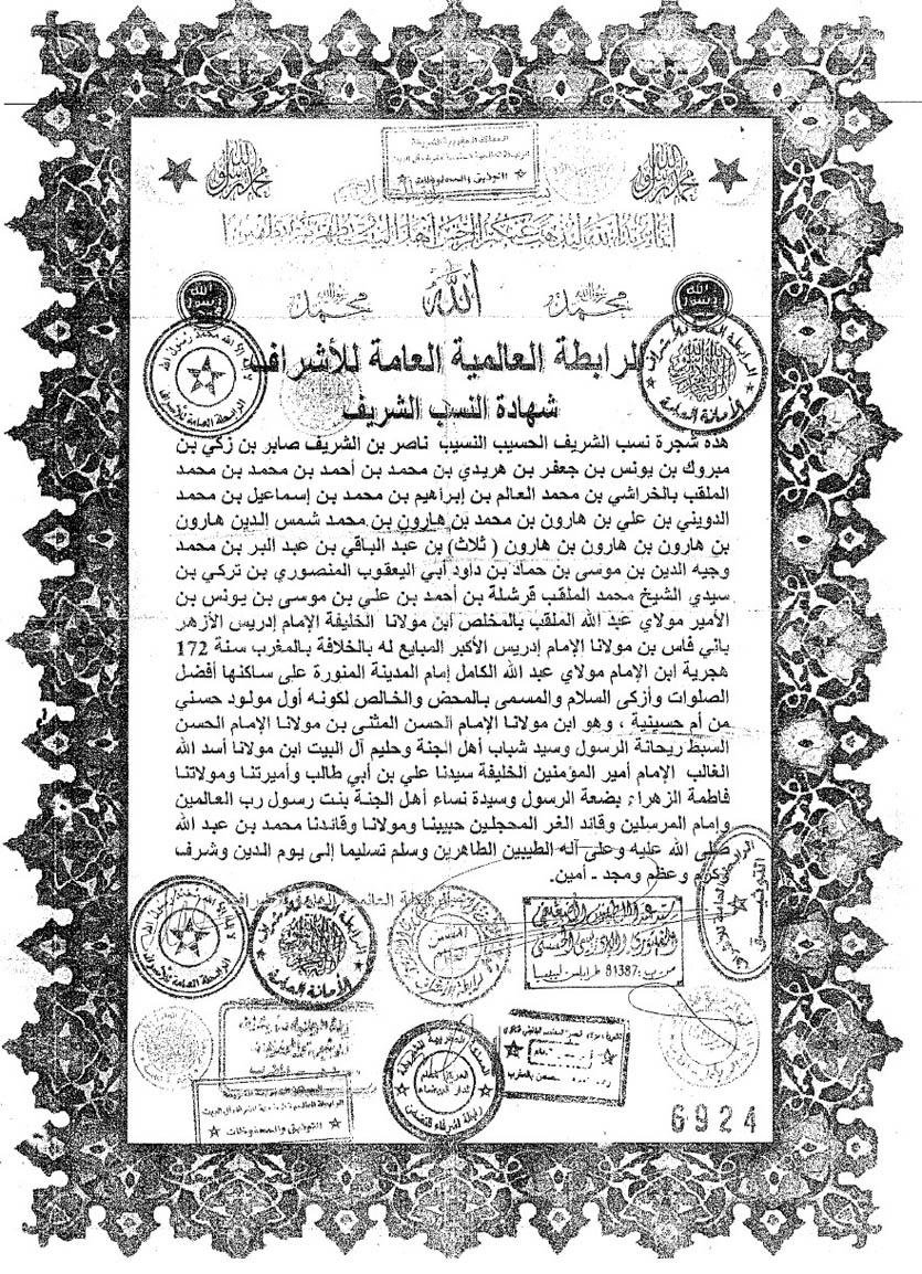 افتراضي رد: شهادة نسب الشريف ناصر الادريسى الحسنى من ذرية محمد شمس الدين هارون