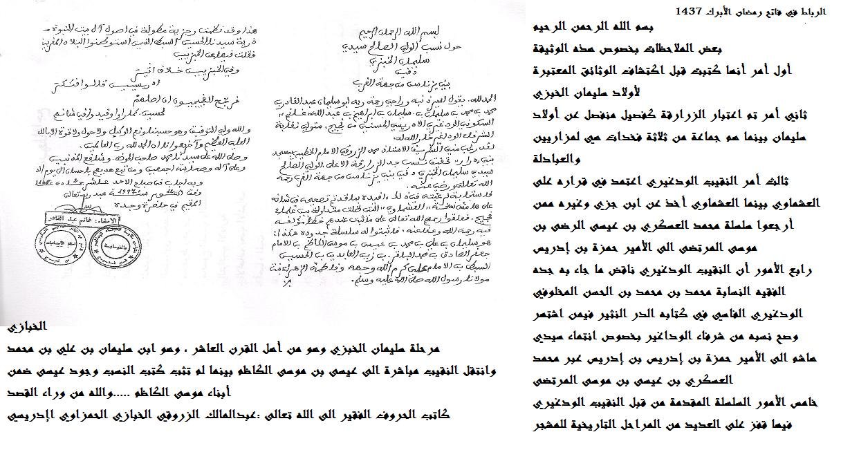 أقدم فيما يلي وثيقة قدمها السيد عبدالقادر غانم متولي نقابة الشرفاء الوداغير تهم نسب سيدي سليمان الخباز جد الشرفاء الزرارقة والعبادلة والمزاريين أهل قرية سيدي سليمان الخبزي حرسها الله (جماعة بني خالد ـــ عمالة وجدة أنجاد ) والله من وراء القصد ..... http://aladdarssah.com/uploaded/9651_01465252494.jpg ᐧ |