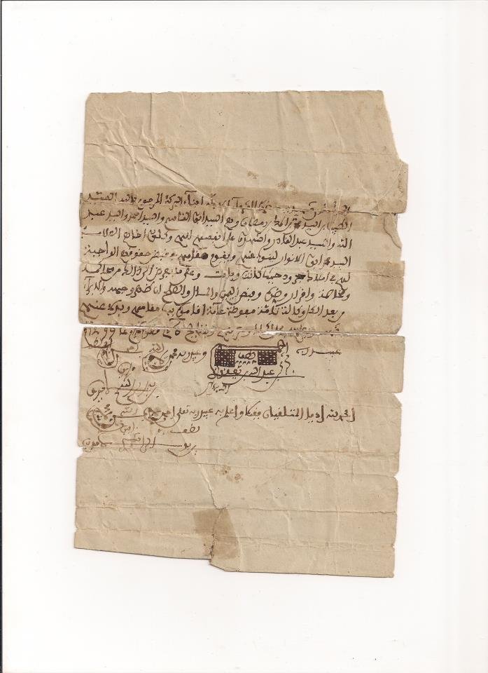 السلام عليكم ورحمة الله وبركاته عقد شراء في صفقة واحدة لكل من سيدي المكي وسيدي محمد نجلي الولي الصالح سيدي رمضان. العقد كان عام 1223 هجرية. http://aladdarssah.com/uploaded/4583_01334012046.jpg |