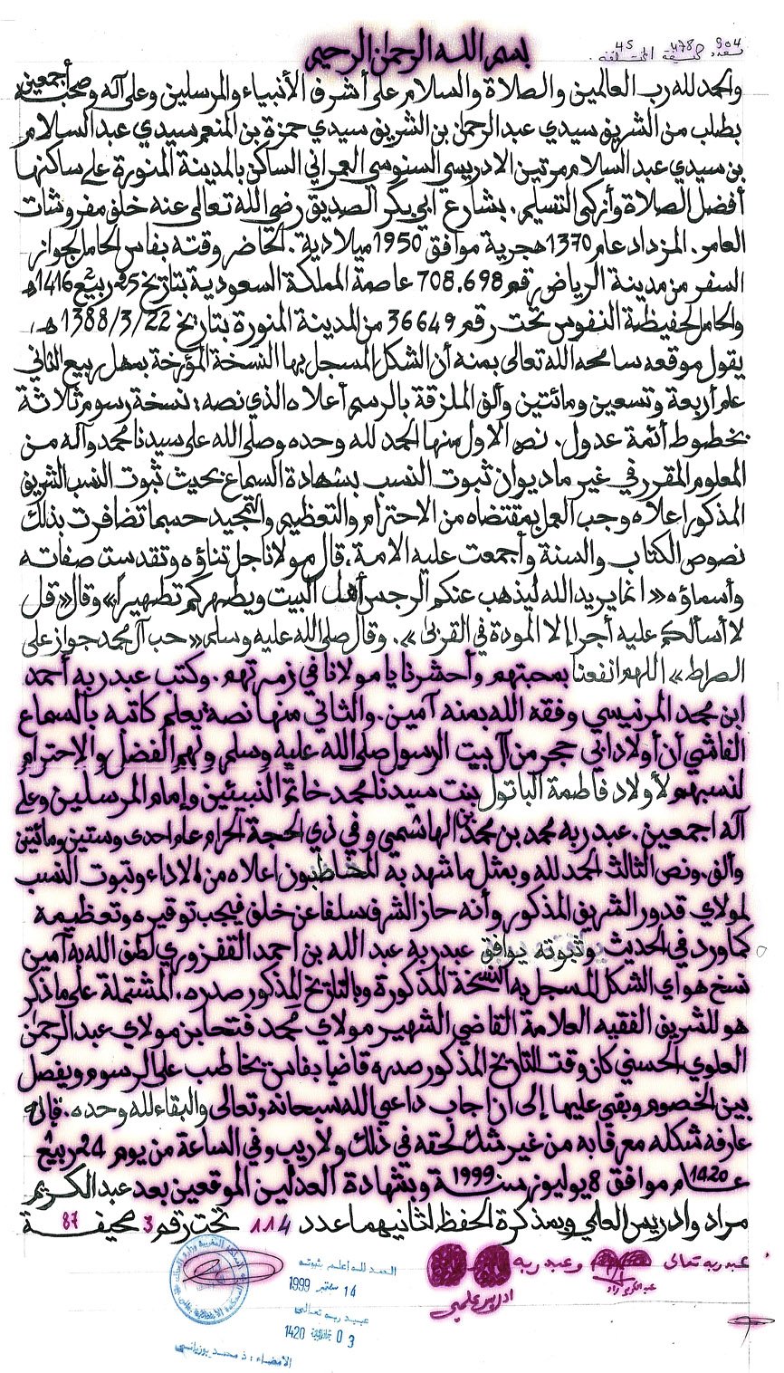 | ظهائر وبطاقات وشهادات وصكوك الأشراف الأدارسة استعراض ودراسة ظهائر وبطاقات وشهادات وصكوك الأشراف الأدارسة المتعلقة بأنسابهم أو عقود أنكحتهم و طلاقهم و أملاكهم و حصر مواريثهم وغيرها ومحاولة تحميلها من خلال رابط لجميع الأعضاء. |