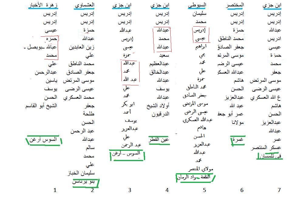 وأما إدريس بن إدريس، فله من الأبناء المعقبين الذين لا خلاف فيهم خمسة: عمر سكن المخاض، وهو موضع بالمغرب، والقاسم الملك بالمغرب، أقيمت له الدعوة ا وضربت له السكة. وعيسى الملك بالمغرب، ويحيى كان في شهر فاس وتاهرت، وعبد االله بالسوس الأقصى.